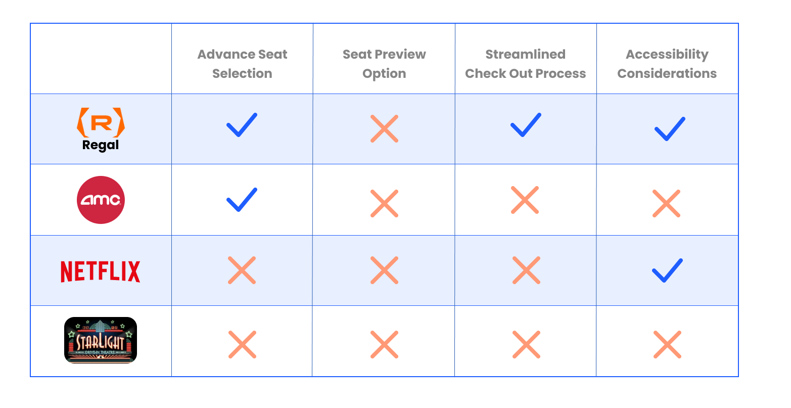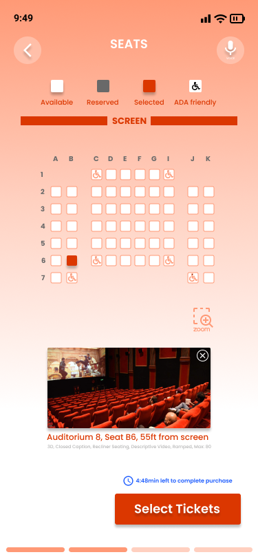 A mobile application that provides visible seat labels, an image preview when making a selection and seat distance displayed on screen so users can make better decisions on seating without feeling anxious before going to the movie.
